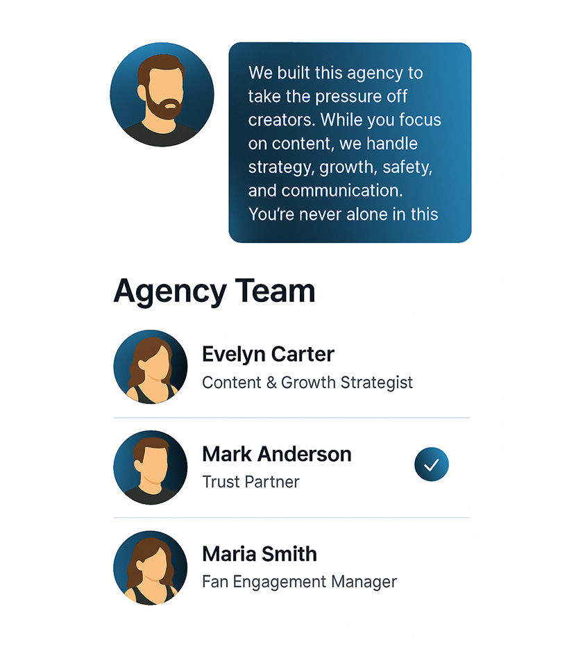 With over 4 years of experience in OnlyFans management, we are now among the leading agencies in the German-speaking and international markets. Our core team consists of 2 managing directors, 3 German-speaking managers, and more than 40 dedicated chat operators. We work efficiently, discreetly, and always professionally. Despite (or precisely because of) the nature of the industry.